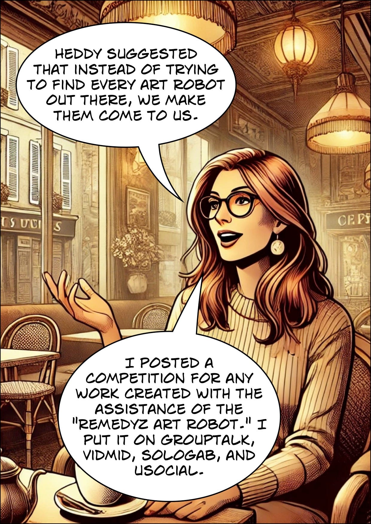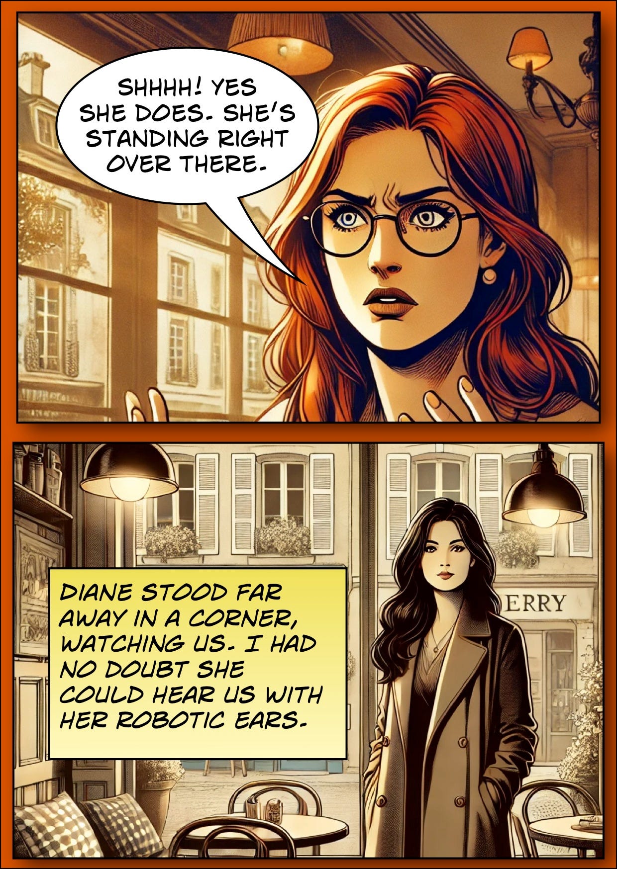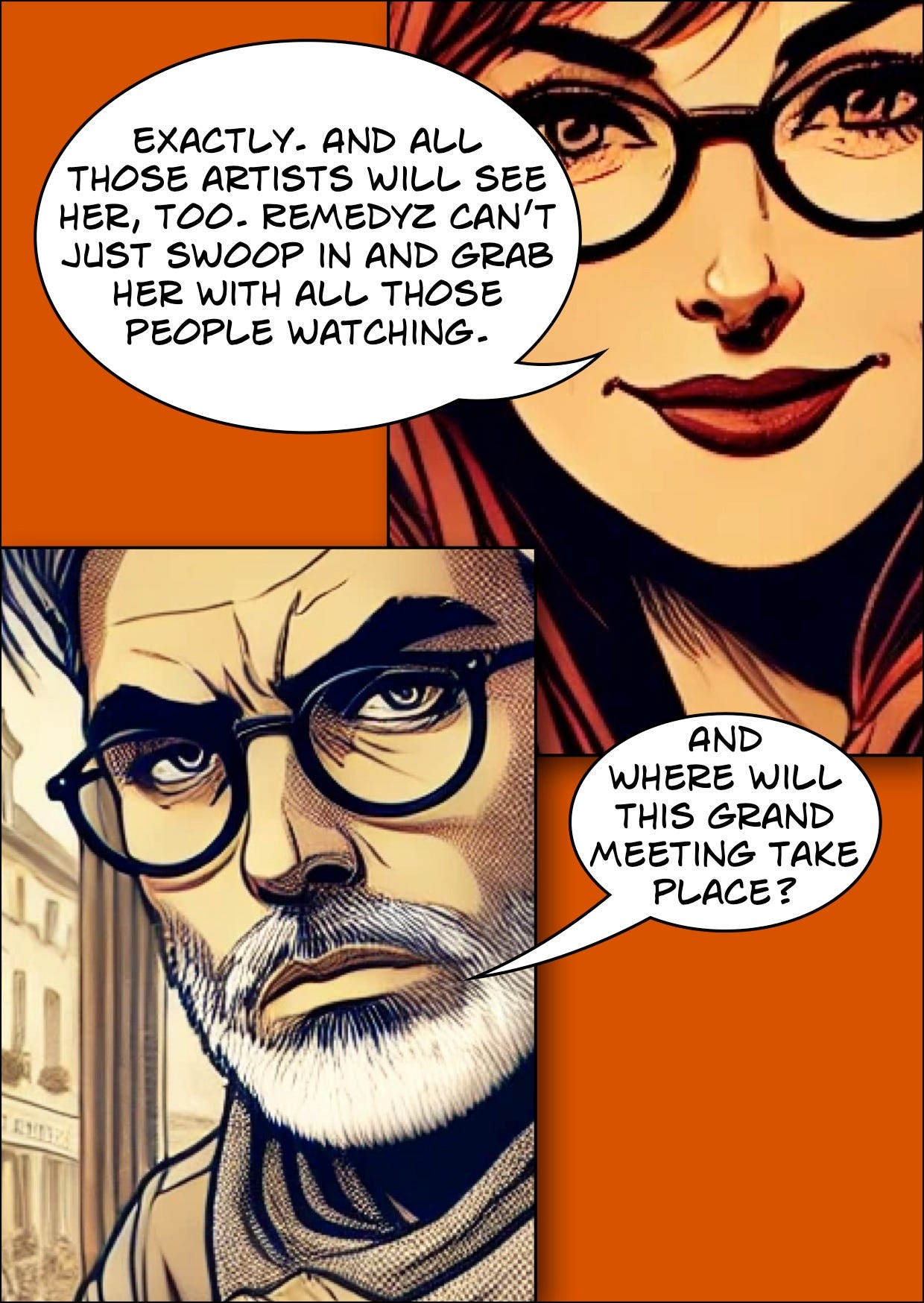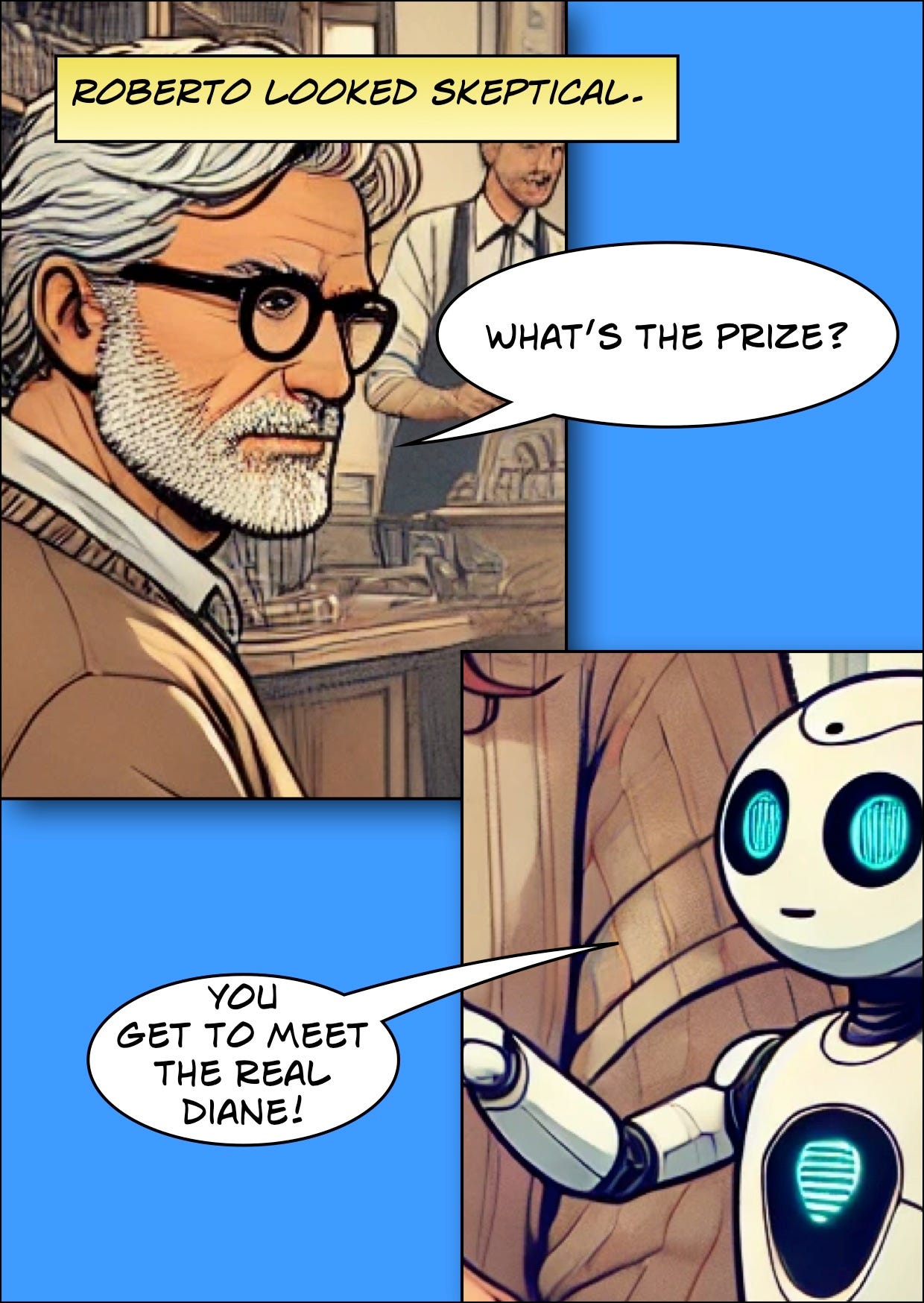 In Chapter 22 I told Roberto that Diane wanted to destroy the remaining clones of herself. I explained to him that each of these art robots was out there helping an artist rediscover their imagination. I needed a plan to help Diane realize how amazing her inspiration was. Suprisingly, Heddy announced he had an idea.