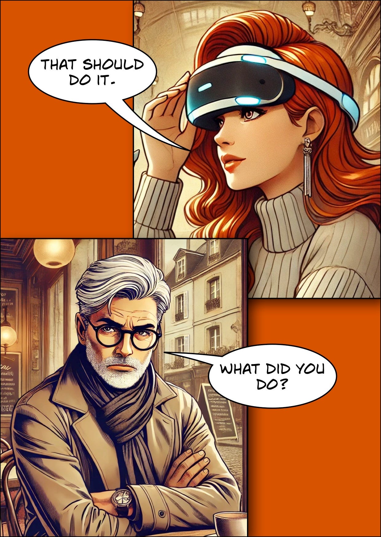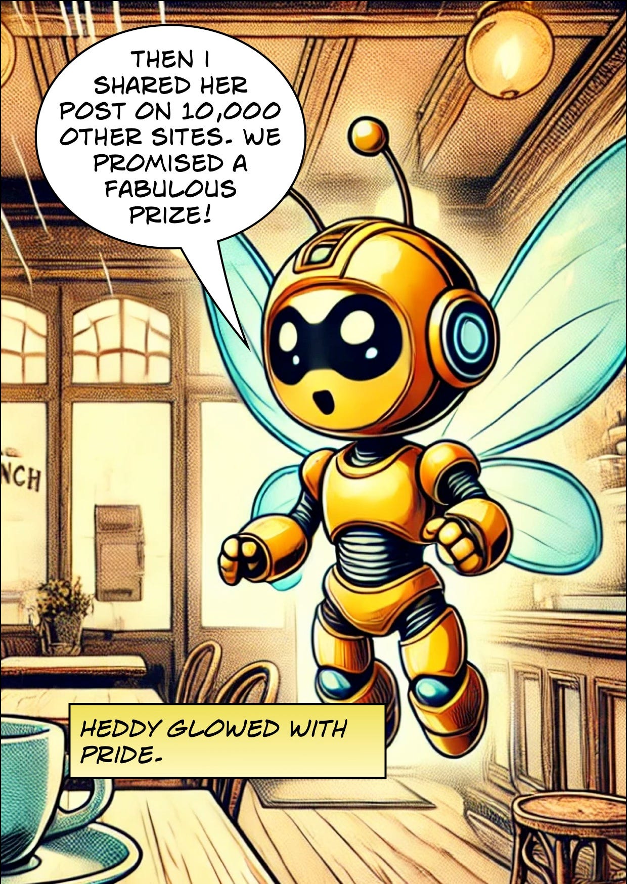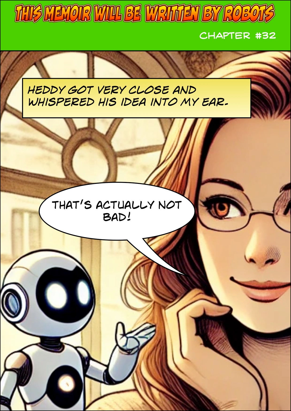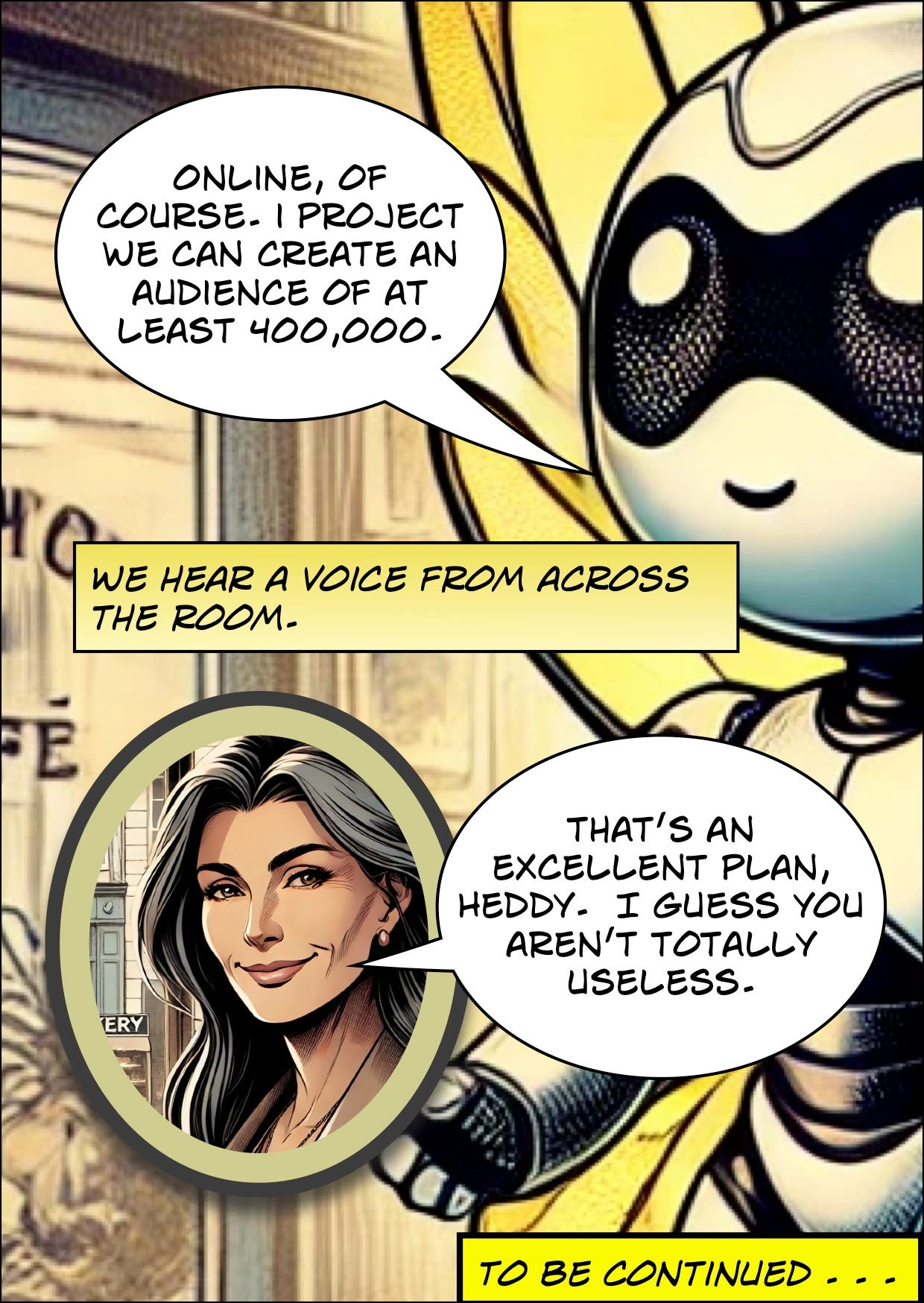 In Chapter 22 I told Roberto that Diane wanted to destroy the remaining clones of herself. I explained to him that each of these art robots was out there helping an artist rediscover their imagination. I needed a plan to help Diane realize how amazing her inspiration was. Suprisingly, Heddy announced he had an idea.